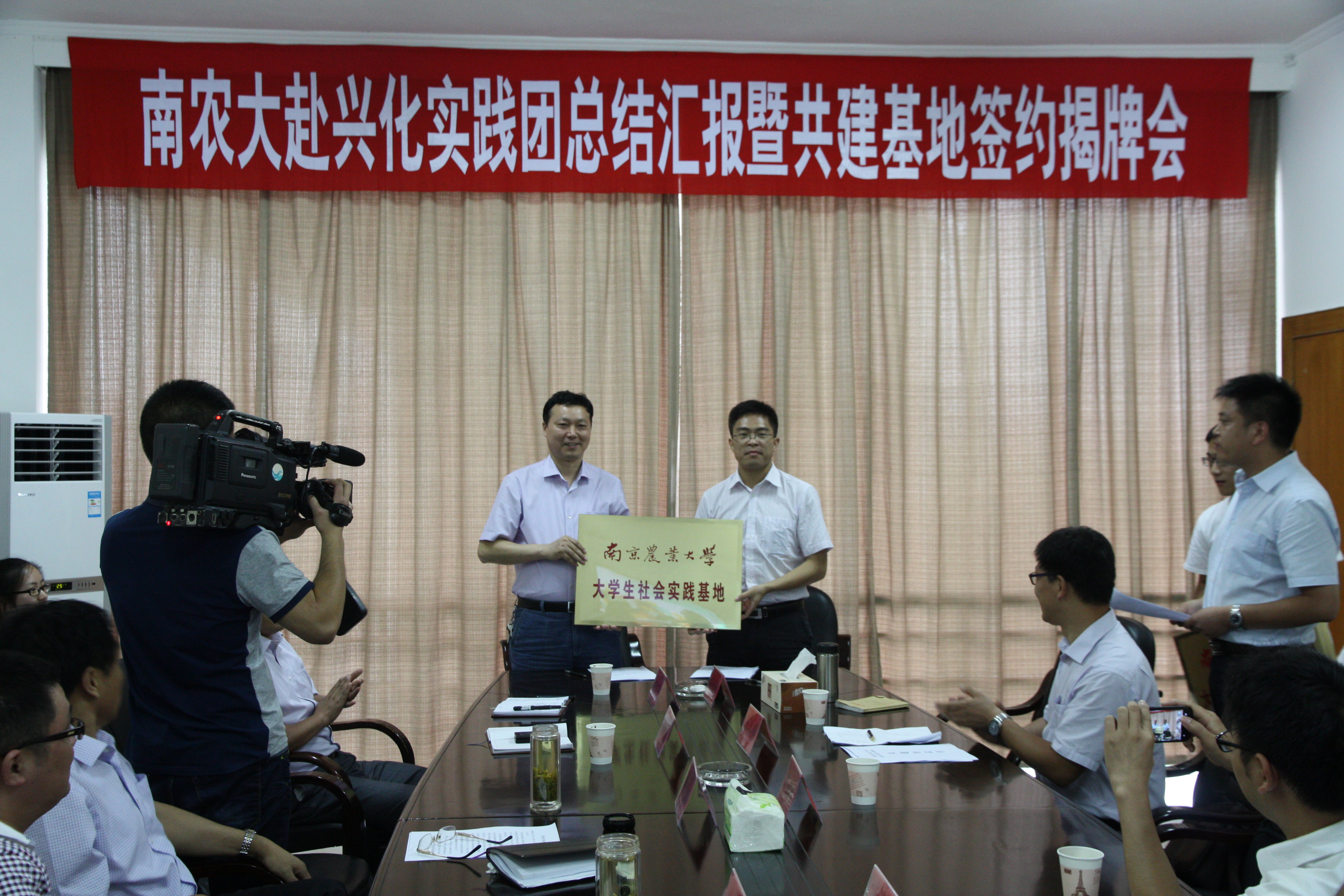 2014年7月14日下午,“南农大赴兴化实践团总结汇报暨共建基地签约揭牌会”在兴化市政府林牧业局举行,出席会议的有兴化市林牧业局陈友洪局长、共青团兴化市委员会吉金楼书记、兴化市大邹镇党委刘启元书记、兴化市委组织部人才科袁文华科长,共青团青娱乐