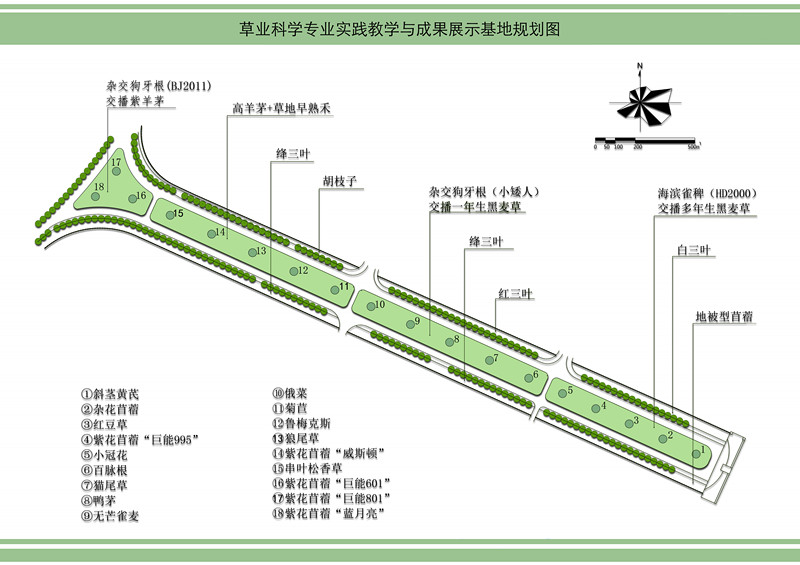 “草业科学专业实践教学与成果展示基地”位于我校白马园区东大门进入后的中央景观大道,总面积约5万平方米。该基地的规划设计方案既充分考虑了草业科学专业的实践教学需求,又兼顾了白马园区景观美化的功能。