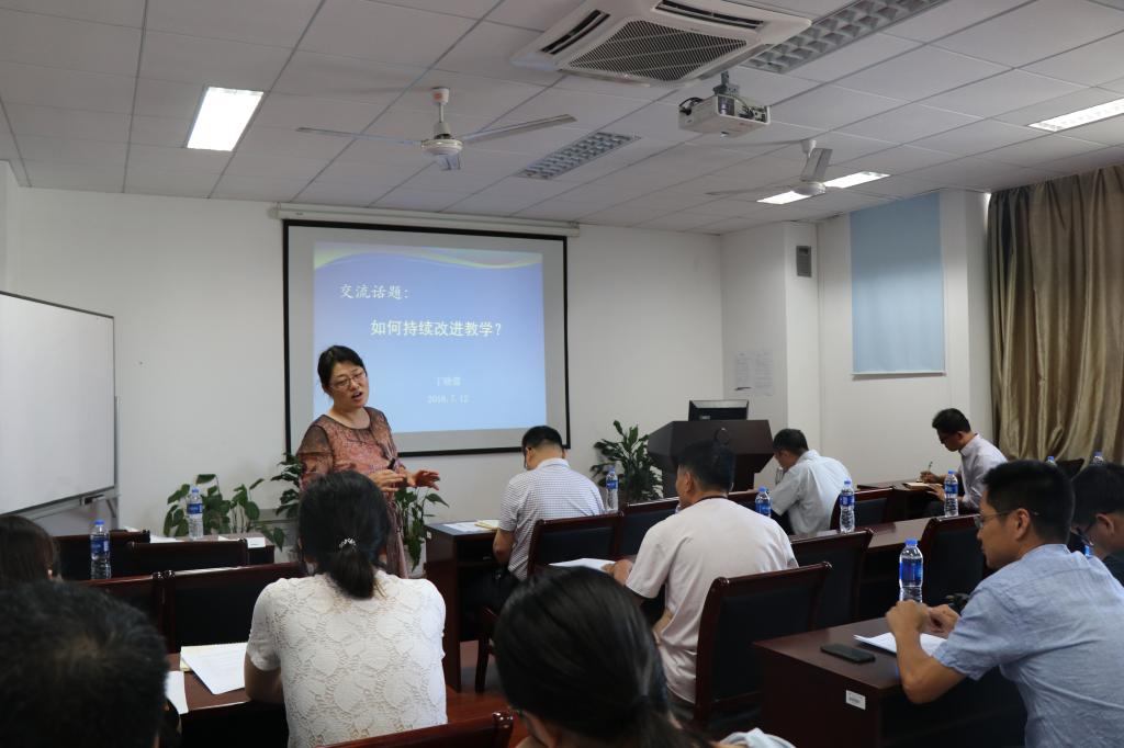 会议分为专家报告和工作研讨两个部分。丁晓蕾作了《如何持续改进教学》的专题报告,她从教师应该具备的七项素质入手,阐述了教师应该以学生的学习为中心、正确确立教学目标、选择多元化的教学模式开展教学活动,并利用建构主义的学习理论,分析了提高学生接受知识的有效途径。该报告激发了与会教师的热烈讨论。