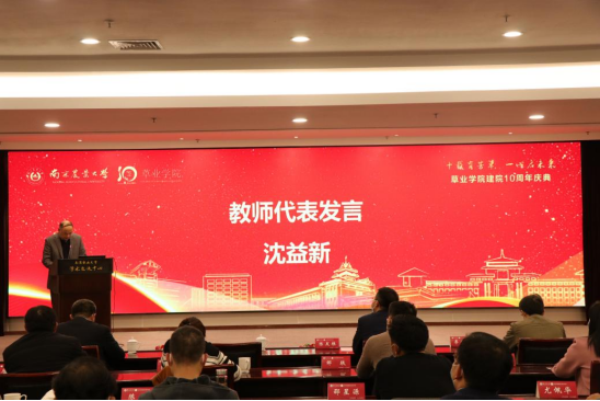 沈益新教授作为教师代表发言中回顾了梁祖铎教授等草业前辈工作中科学严谨的精神,手把手指导青年教师提升教学能力,对学生的既严又爱的认真负责精神,希望现在的青年教师要先做好老师,才能成为大先生。