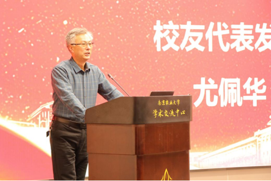 江苏波杜农牧股份有限公司董事长、校友代表尤佩华致辞,他代表校友向学院师生致以问候和祝福,深情回顾了在校学习期间的收获和感想,并表达了对母校培养的感激之情。