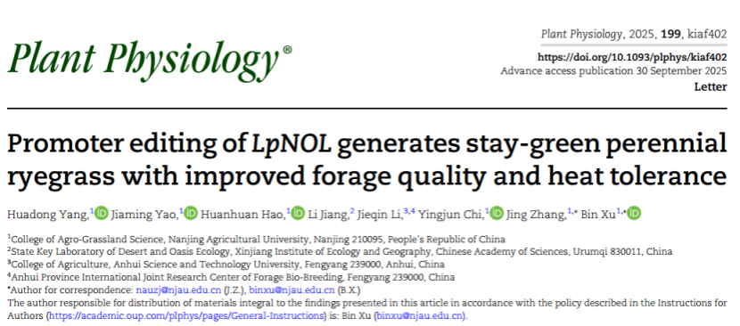 徐彬教授研究组在Plant Physiology期刊发表题为Promoter editing of LpNOL generates stay-green perennial ryegrass with improved forage quality and heat tolerance的研究论文。研究鉴定了LpNOL启动子中响应高温的关键元件,并采用基因编辑技术定向编辑高温响应关键区段,创制了耐高温、持绿型黑麦草新材料。