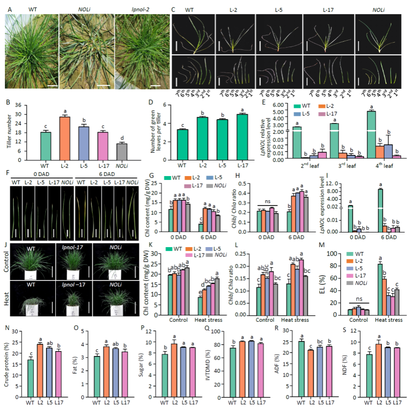 进一步研究发现lpnol突变体株系的分蘖数与野生型(WT)材料相当,基因编辑LpNOL启动子弥补了RNAi-LpNOL(LpNOLi)株系分蘖数减少等缺陷。在离体叶片暗诱导处理后,lpnol株系的总叶绿素含量和叶绿素b/a的值均显著高于WT;在自然衰老实验中,lpnol株系每个分蘖上具有更多的绿色叶片数,表明lpnol株系具有持绿表型。对各突变体株系进行高温处理,发现lpnol株系具有更高的叶绿素含量、叶绿素b/a值和更低的电解质渗漏率(EL),结果表明lpnol株系的高温耐性显著高于WT。此外,lpnol突变株系的粗蛋白(提高41.3%)、脂肪(23.3%)、糖(24.3%)、干物质消化率(13.8%)和中性洗涤纤维含量均显著高于WT,酸性洗涤纤维含量显著低于WT,说明lpnol株系具有更高的饲草品质。