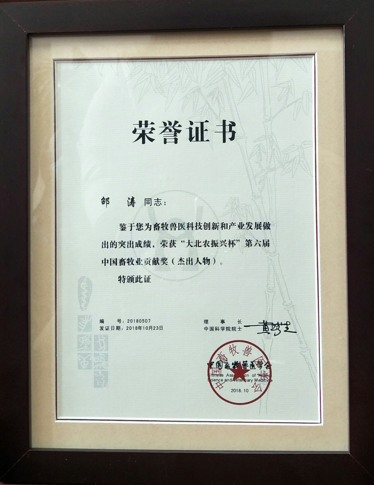 邵涛教授荣获“第六届中国畜牧业贡献奖(杰出人物)”,成为荣获该奖项的全国十名获奖者之一。