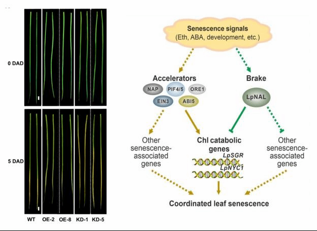 叶片衰老是一个循序渐进的过程,一方面受到加速因子(衰老促进因子)促进作用,另一方面被刹车因子(衰老抑制子)限速。LpNAL是叶片衰老进程中的一个刹车因子,通过与其他转录因子协同作用,共同调控叶绿素降解和叶片衰老进程。