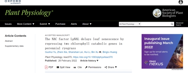 草类逆境与分子生物学团队题为 The NAC factor LpNAL delays leaf senescence by repressing two chlorophyll catabolic genes in perennial ryegrass的研究论文,揭示了关键叶绿素降解基因上游衰老抑制子调控叶绿素降解及叶片衰老的分子机制。
