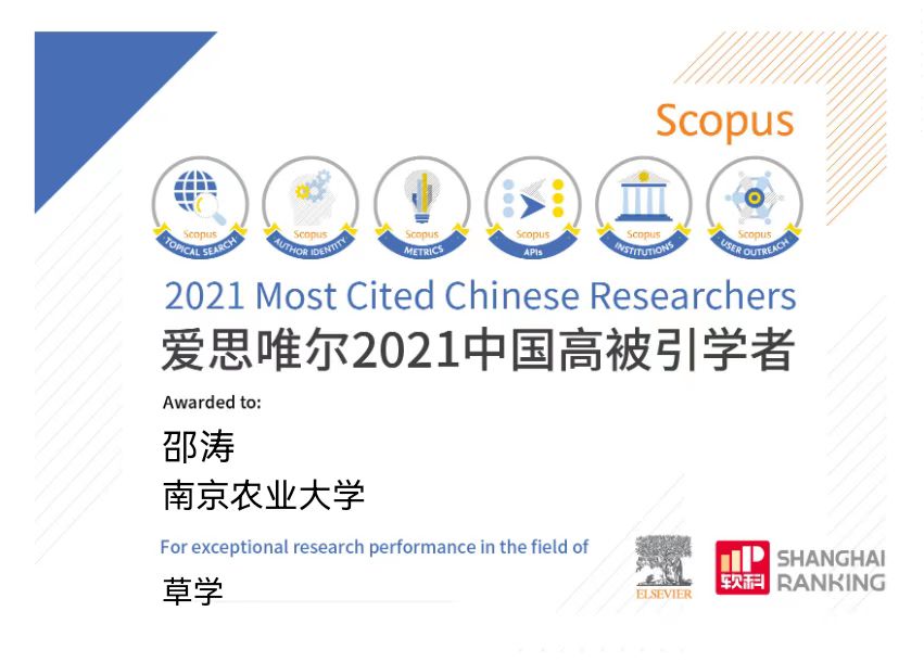爱思唯尔(Elsevier)于2021年4月14日发布2021年“中国高被引学者”(Most Cited Chinese Researchers)榜单,草学学科共有5人入选,青娱乐 郭振飞教授和邵涛教授荣登榜单,入选人数占40%(2/5),居第一位。2021爱思唯尔“中国高被引学者”榜单以全球权威的引文与索引数据库——Scopus作为中国学者科研成果的统计来源,采用软科(上海软科教育信息咨询有限公司)设计的遴选方法,最终得到4701名各学科最具全球影响力的中国学者。