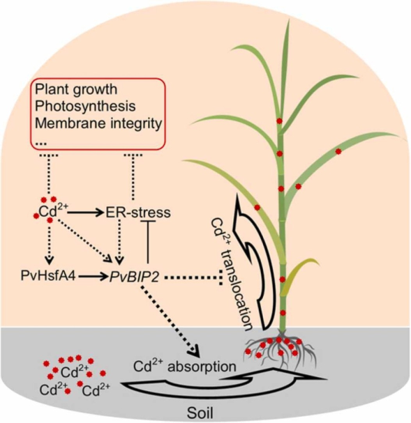 该团队在前期研究中发现Cd胁迫导致柳枝稷的内质网胁迫响应,其中有4个内质网定位分子伴侣蛋白(BiP2s)和23个热机转录因子(HSFs)均受到Cd胁迫上调表达。利用Cd敏感酵母突变体对上述BiPs和HSFs进行筛选,发现PvBiP2和PvHSF4均能提高酵母的镉耐性。在镉胁迫和ER-胁迫诱导剂(DTT)的处理下,PvBiP2表达量上调,且PvBiP2启动子中存在HSE元件。利用Y1H及体内激活实验证明PvHSF4能够识别并激活PvBiP2的表达。在柳枝稷中过量表达PvBiP2不仅有效提高了柳枝稷的镉耐性,导致更高的镉积累量(提高90-140%)及较低的镉迁移效率(降低46-57%),还显著提高了柳枝稷的生物产量(提高40-45%)。因此PvHSF4-PvBiP2分子模块可有效提高柳枝稷的镉耐性,PvBiP2具有提高提高植物镉耐性和生物产量的“双效作用”,可作为柳枝稷及其他植物遗传改良的优质目标基因加以开发利用。