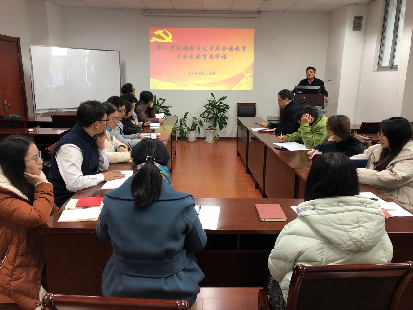 会议室集中学习了习近平主席全国教育大会上的讲话精神。支部书记邵涛逐条解读了习近平总书记的讲话内容,特别强调了教师是人类灵魂的工程师,是人类文明的传承者;积极主张教师要以德育为根本,身教重于言教;要以9个坚持发展我国的教育事业,特别是要弄清楚培养什么人这个首要问题;要在6个方面下功夫,其中加强品德修养、增强综合素质、厚植爱党爱国是极其重要;在评判人才上要克服唯分数、唯升学、唯文凭、唯论文、唯帽子的顽瘴痼疾;特别是在家庭教育上要给孩子上好人生的第一课。各位党员结合自身情况发表了感言,交流了在教书育人、培养学生创新思维、创新意识、教学改革创新等方面的经验和体会,把做一位优秀教师作为努力的方向。