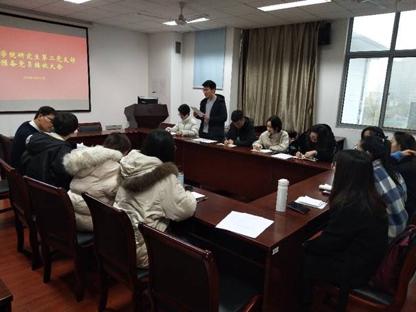 研究生第二党支部在理科南楼F304召开预备党员接收大会。出席此次会议的党员共11人,其中有表决权的党员8人。研究生第二党支部发展对象赵卓均、崔文杰参与了此次会议,党总支副书记高务龙同志参加了此次会议。会议由党支部副书记季晓敏同志主持。