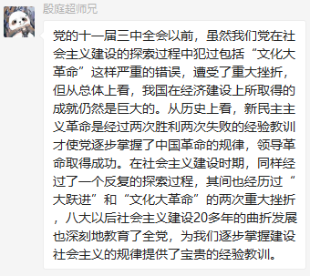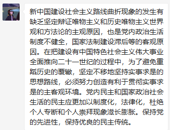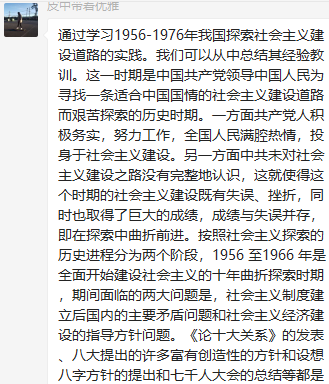 党支部各党员在群里积极发表学习心得。郑钰莹同志提出要杜绝个人专断和个人崇拜,通过制度和法律进行约束,保持党的先进性。宋俊龙同志提出为了避免重蹈社会主义建设过程中出现的错误,我们党必须坚定不移地坚持实事求是的思想路线。罗思敏同志提出虽然国家在社会主义建设过程中遭受过严重挫折,但社会主义建设仍然取得了很大成就。