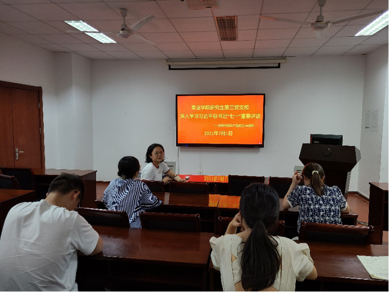 研究生第三党支部在集体观看中国共产党成立100周年庆祝活动直播结束之后于理科南楼F304召开了关于习近平总书记“七一”重要讲话的专题学习会。会议由党支部副书记吴佳璇主持。