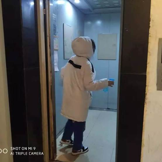李晶同学早上起来的第一件事,就是对门口楼道电梯等进行义务消毒,以确保公共通道无菌,她说这也是对家人守护的一种方式。