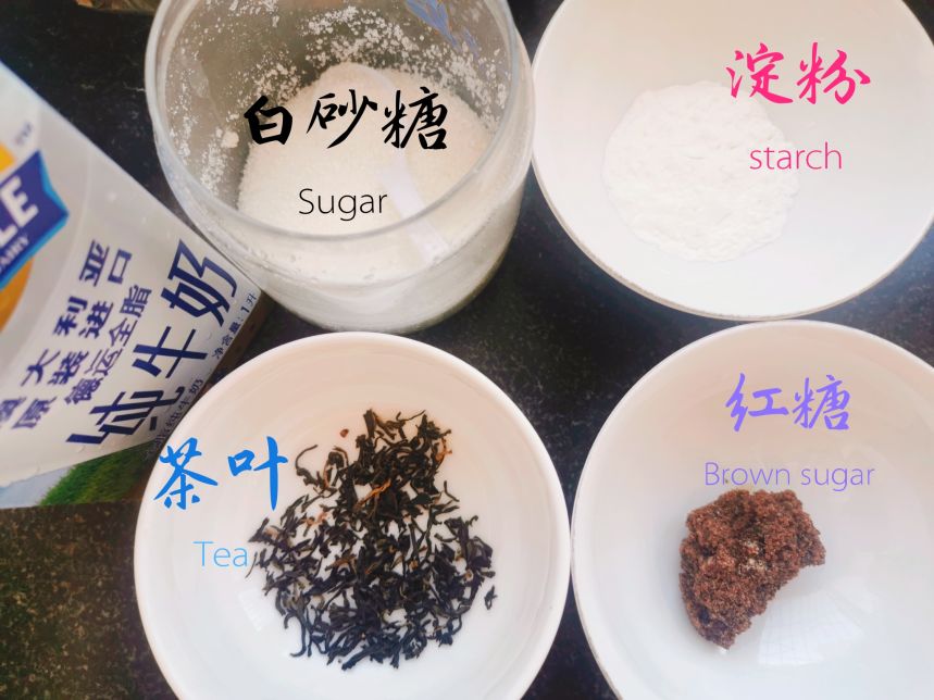 准备材料:红糖,淀粉,茶叶(红茶、绿茶都可以),牛奶,(纯牛奶、奶粉都可以),白开水