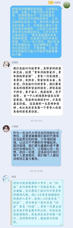 草业国际181团支部开展“学习习近平总书记给北京大学援鄂医疗队全体‘90后’党员的回信”线上学习,讨论青年大学生的使命与担当。
