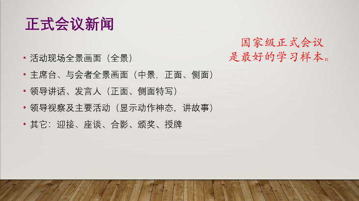 好的新闻照片,有深度能够引导我们的思想,通过画面直接向我们叙述故事,强烈的对比冲击抓人眼球,以增加阅读量,更重要的是其中包含温度,传递善良和情怀。但是新闻图片也需尊重事实,图不代表全部。而新闻也有不同的分类,正式会议拍摄需要我们参考国家级正式会议照片,多加模仿;体育新闻更考验我们的抓拍能力,用快门优先模式,自动曝光,要保证主体清晰;人物拍摄:专访则需要我们拍摄出人物的故事感,想要向我们传达的理念,而隐蔽拍摄需抓拍反映人物内心的动作和表情,以情动人;突发事件和重大新闻需要我们第一时间抵达,实时追踪报道。