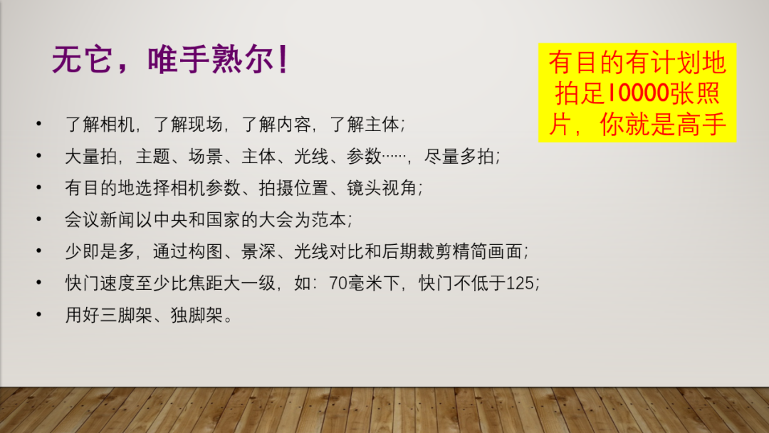 通过高院长的讲解,我对新闻摄影有了更多的知识储备,也反思了之前宣传工作中各类摄影出现的问题。如同高院长在培训中所说,今后我将把学到的知识和技巧在实践中运用,在实践中总结得到适合自己的方式,逐步提高摄影水平。