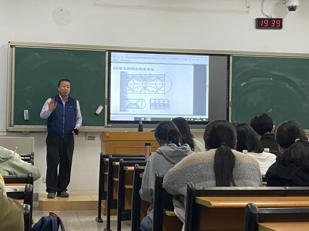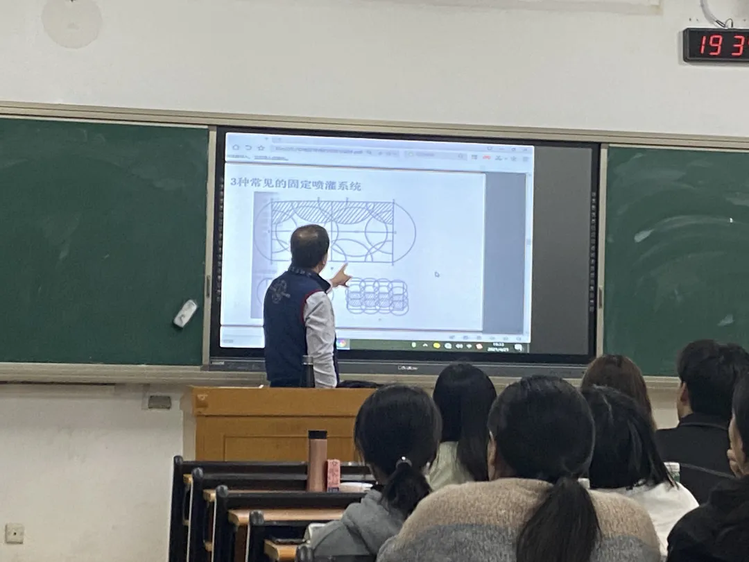 紧接着,杨教授为同学们讲解了规划书的具体要求,将总体分为文本与图纸两方面。针对排水系统、灌溉系统、草坪草种的设计,以及施工方案的编制等基本问题,杨教授都进行了细致的介绍。对草种的选择、如何获取品种详细信息等与大赛密切相关的问题也做出了解释。