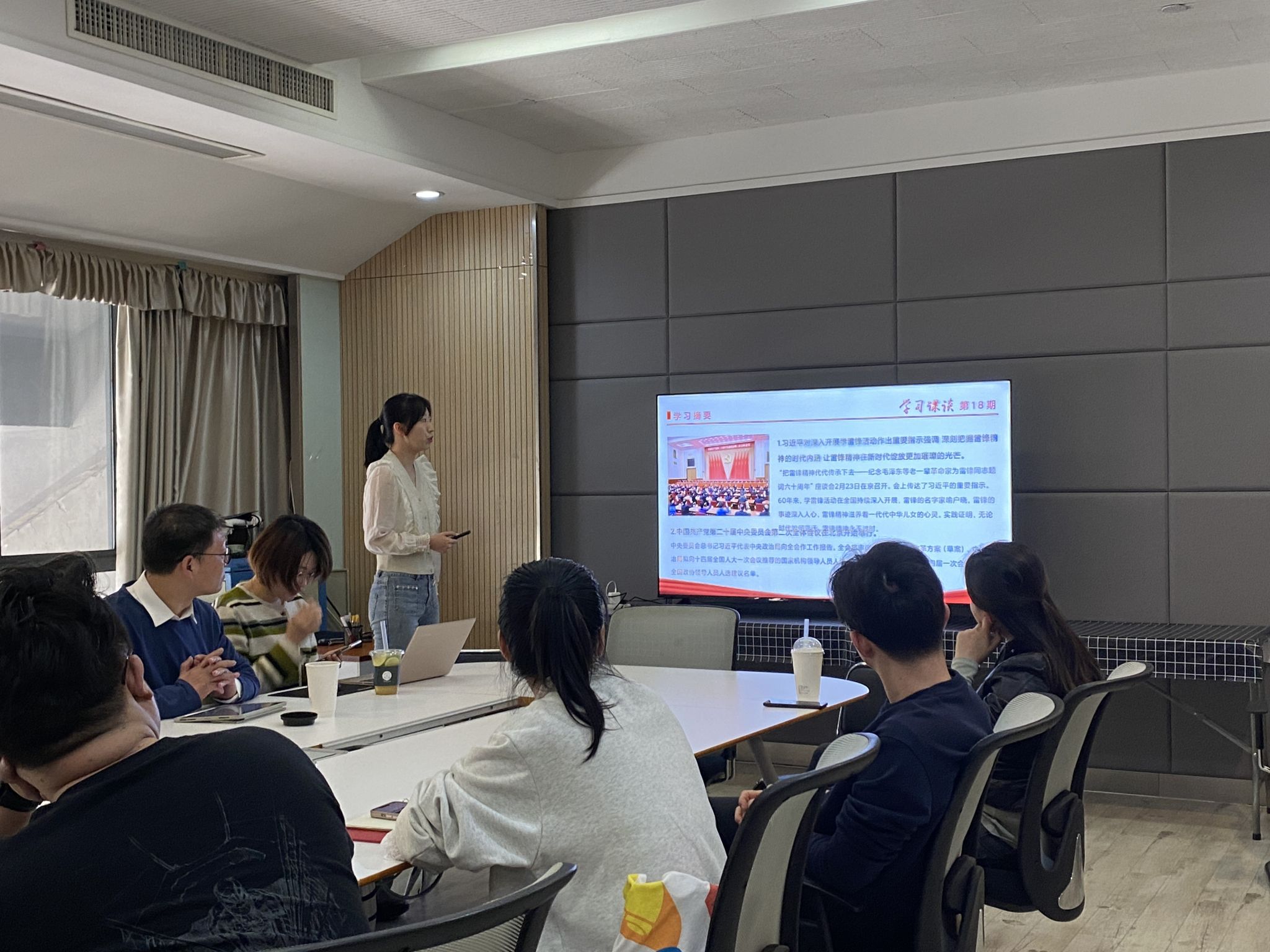 首先进行的“学习摘要”环节中,李宇宣带领参会人员学习回顾近期全国思政热点,包括“习近平关于开展学习雷锋活动的重要指示”“中国共产党第二十届中央委员会第二次全体会议在北京举行”“<求是>杂志发表习近平总书记重要文章<新时代党和人民奋进的必由之路>”等重要内容。接下来的“朋辈课堂”环节中,李宇宣又展示了各兄弟院校,关于做好毕业生就业工作、加强学生思想政治教育以及学习贯彻习近平总书记关于教育重要论述等多方面工作举措。