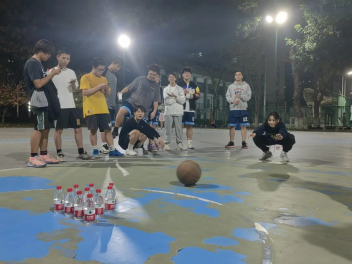 第二场比赛为趣味赛,趣味赛包含两个项目,定点投篮和保龄球。定球投篮游戏规则为:男生站在三分线处投篮,投中加3分,一共五次机会;女生站在罚球线处投球,投中即为3分球,一共五次机会。现场参赛同学都跃跃欲试,比赛紧锣密鼓地进行,投中了为其欢呼,未投中则为其加油打气。最终男生组冠军为李鑫宝,女生组冠军为姜婉琦。接下来进行的是我们的保龄球游戏,参赛同学排成一队依次进行推球,比赛规则是站在罚球线处向前推出篮球,击中摆放在地上的十瓶水,击中个数总和越大即为胜出,一共三次机会。比赛也十分激烈,大家都瞄准好方向,掌握好适中的力度,击中地上的水瓶。最终比赛冠军为孔艺璇。比赛完毕后,为各位冠军及冠军队伍发放奖品,并拍照留念。