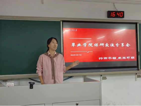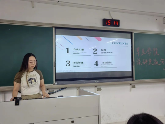 会议开始,学院团委组织部部长唐梦圆首先上台阐明了这次会议的主要目的——让学生们对今后的大学生活有大致的规划。随后,七位已经通过推免被录取为2024级研究生的大四学姐依次上台发言,分别从几个方面详细地介绍了保研的各个事项。