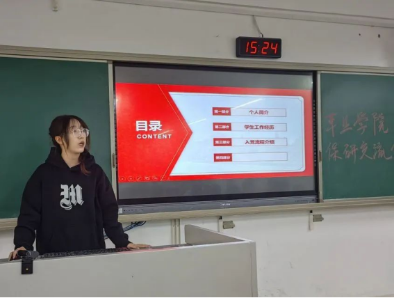 已经被华东师范大学录取的丁一楠同学就自己的学生工作经历讲述了自己从中获得的益处,鼓励同学们多多加入学生会、参与学院活动,服务他人的同时提升自己。她也为同学们介绍了入党的基本流程,让有入党意向的同学们吃了一剂定心丸。