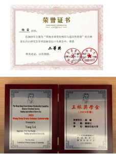 最具影响力研究生、王栋奖学金、中国草学会年会博士研究生学术汇报二等奖、吉林省长白山“草地全球变化响应与适应性管理”研究生学术论坛汇报二等奖、博士生二等奖学金、金善宝奖学金、“青春绽放,与你同行”羽毛球女子单打季军、研究生文明宿舍。