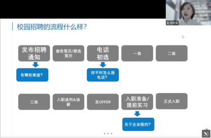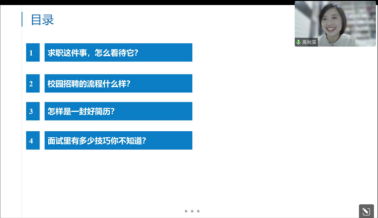 高女士在简要介绍自己的生涯经历后,结合自己多年负责校园招聘项目和新员工选拔培养工作的经验,求职认知、校园招聘流程、制作好简历、面试技巧等四个方面做了详细讲解。