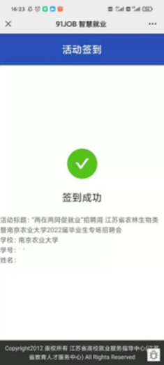 现场扫描招聘会签到二维码,登录后即可签到成功。向工作人员出示签到成功界面后入场。