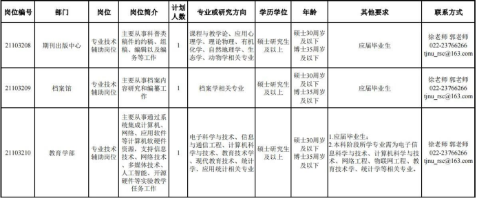 公开招聘方案于2021年4月8日在天津市教育委员会网站(//jy.tj.gov.cn)、天津师范大学门户网站(//www.tjnu.edu.cn)、天津师范大学人事处主页(//rsc.tjnu.edu.cn)公开招聘专栏发布。具体招聘岗位见《天津师范大学2021年公开招聘辅导员、组织员、专业技术辅助岗位、硕士教师岗位工作人员计划表》。(点击“阅读原文”下载)备注:官网已经找不到计划表