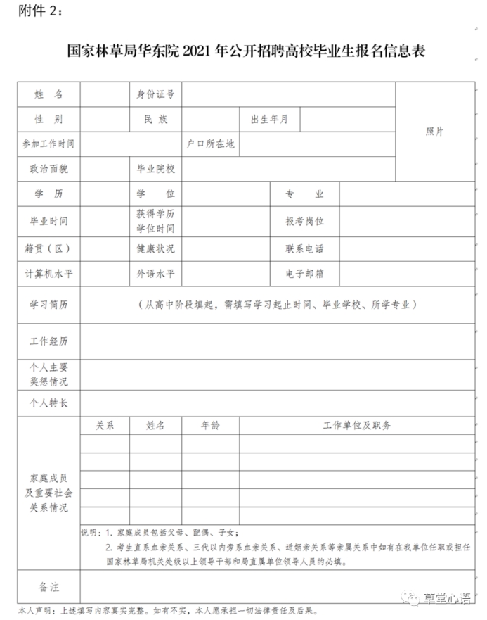 2. 报名方式及要求:考生采取网上报名方式,每名考生只能报考一个岗位。考生在规定时间内如实客观填写《国家林草局华东院2021年高校毕业生招聘报名信息表》(附件2),除个人基本情况外,还应准确填写家庭成员信息(包括父母、配偶、子女姓名、工作单位及职务等),如考生有夫妻、直系血亲、三代以内旁系血亲、近姻亲等亲属关系的人员在我单位任职或担任国家林草局机关处级以上领导干部和局直属单位担任领导人员的,必须如实准确填写。将报名信息表、本人身份证、就业推荐表或毕业证、成绩单(需加盖毕业学校公章)、个人荣誉证书、发表论文等相关材料扫描件及1寸正面免冠彩色电子照片发送至电子邮箱([email protected]),邮件标题按“岗位序号-毕业院校-姓名-专业”的格式命名。