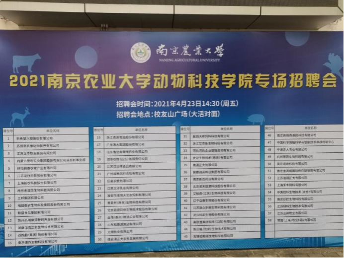 青娱乐 动物科技学院于2021年04月23日下午组织专场招聘会,期中共包括20家上市企业的58家农牧企业、生物制药企业等单位来校招聘,除农牧技术岗位外,还提供大量财务、管理、技术、机械工程、软件工程等岗位。欢迎全校各专业毕业生积极参加!!!