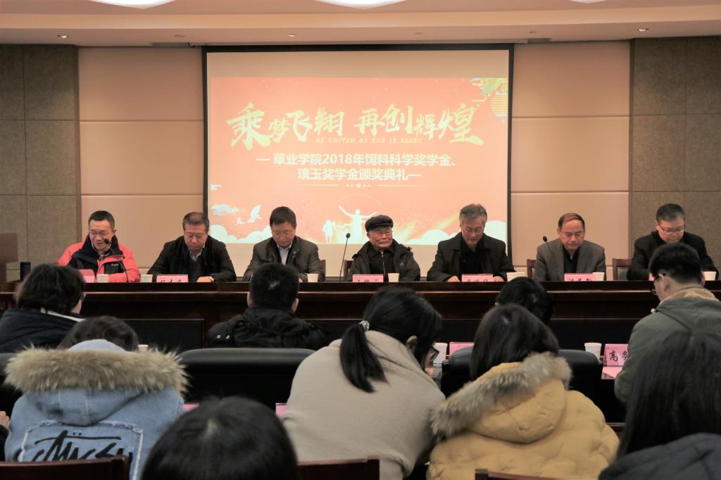 在行政北楼会议室举行了“2018年饲料科学奖学金、璞玉草业科学奖学金颁奖典礼”。86岁高龄的王槐三教授、校发展委员会张红生主任、江苏波杜农牧股份有限公司尤佩华总经理等嘉宾应邀出席,学院党总支书记李俊龙 、副书记高务龙以及全体教师、研究生和部分本科生参加了会议。典礼由青娱乐