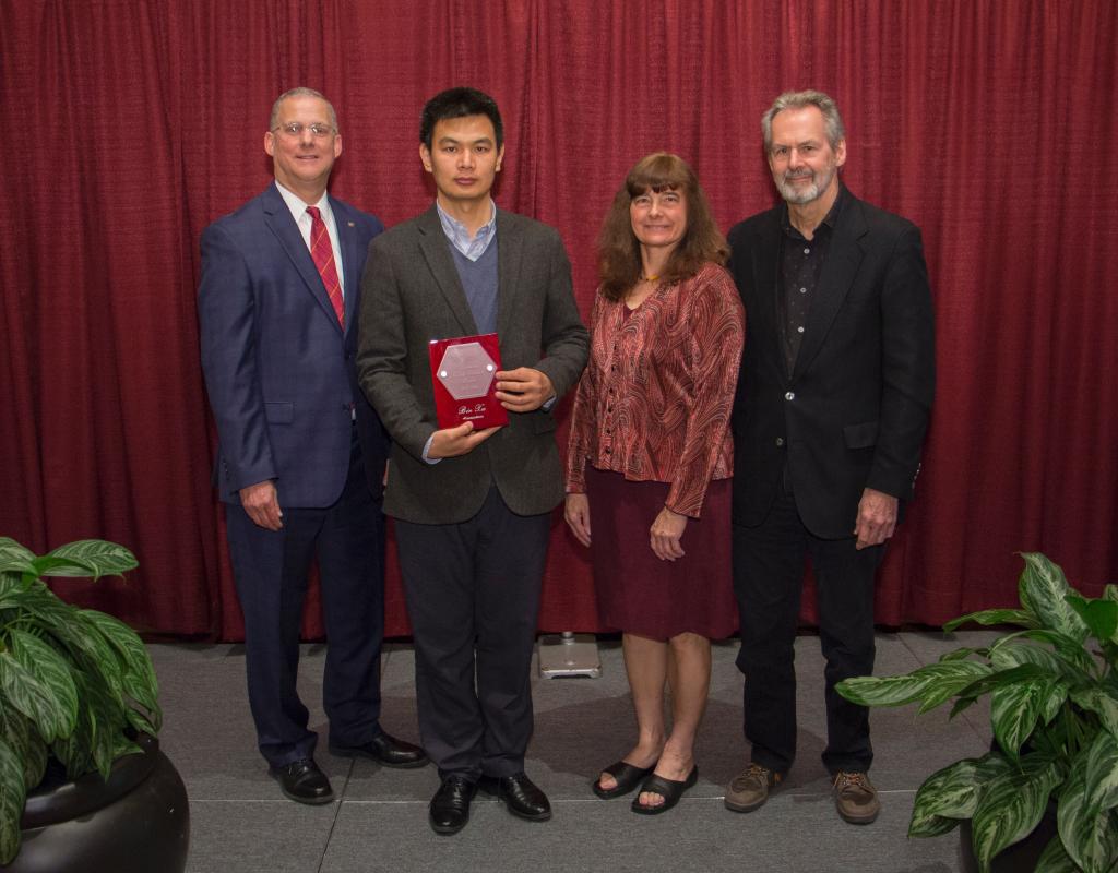 左起:Dr. Alan Grant (农业与生命科学学院院长), Bin Xu, Mrs. Jamie Lucero (校友办主任), Dr. Richard Veilleux (园艺系系主任)